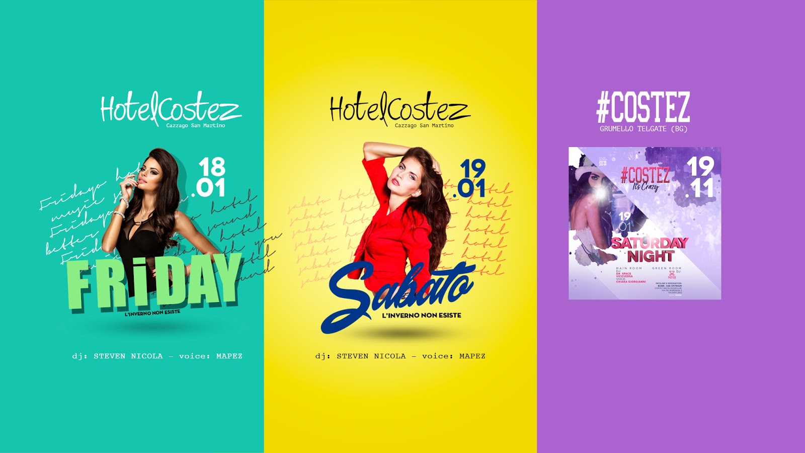 Venerdì 18 e sabato 19 gennaio 2109 all'Hotel Costez (Cazzago - BS) al mixer c'è Steven Nicola, professionista del mixer capace di far muovere a tempo chiunque. Alla voce invece arriva Mapez, un vero personaggio, da sempre concentrato sul dare energia al pubblico. All'Hotel Costez la formula anticrisi (ingresso libero e consumazione facoltativa) alza sempre il tasso e la qualità del divertimento.
